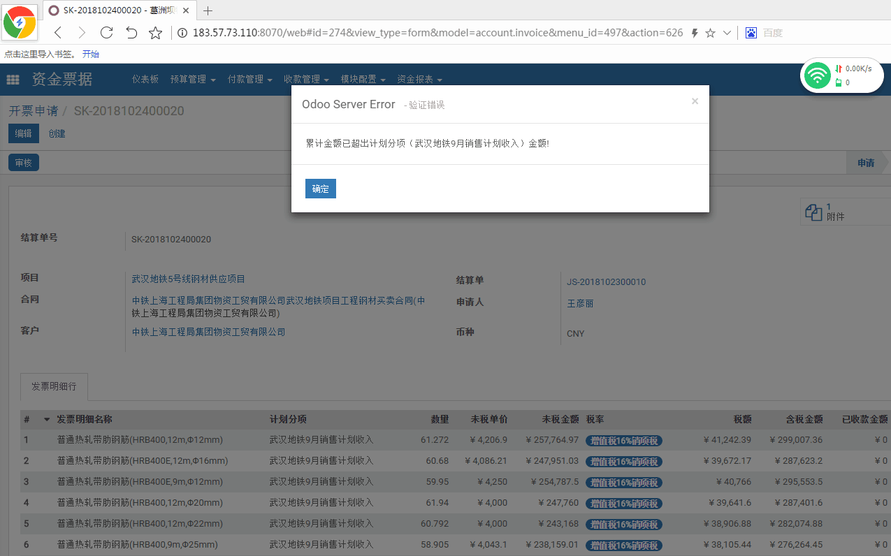 在进行付款申请或开票申请时出现“累计金额已超出计划分项金额”的错误提示,如图。